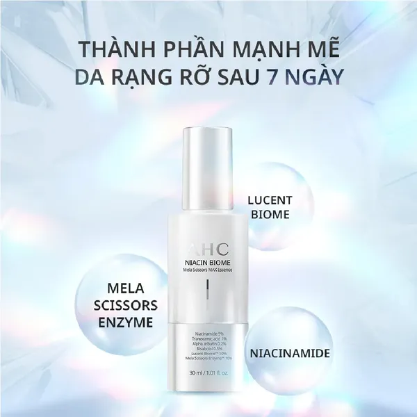 Niacin Biome là dòng dưỡng sáng da chuyên sâu của AHC, sử dụng công thức độc quyền Niacin Biome Complex - “công nghệ lớp cắt vàng 3 tác động” với các thành phần bật về công dụng làm trắng sáng da. Sản phẩm cao cấp dòng Niacin Biome sẽ tập trung cải thiện & ngăn ngừa các vấn đề ở da như da kém đều màu, thâm nám, tàn nhang trong 7 ngày.